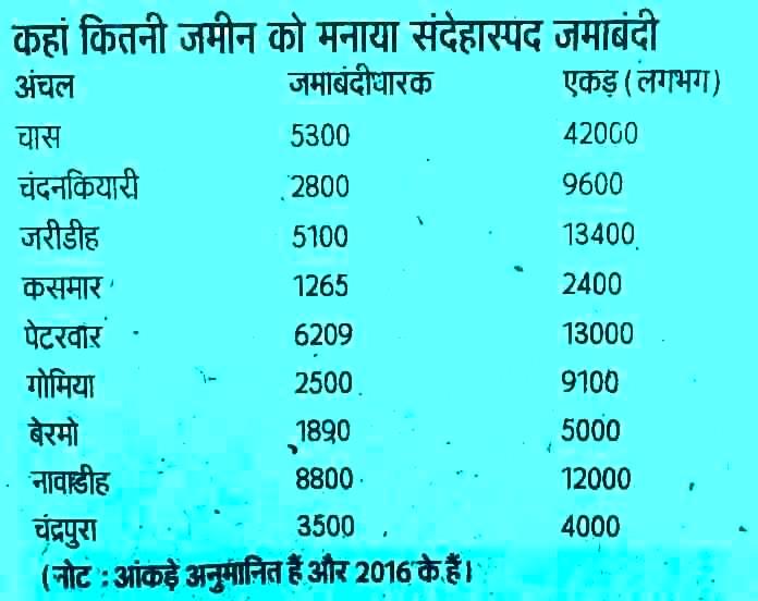 ज़िले में संदेहास्पद जमाबंदी का मामला फिर एक बार तूल पकड़ता दिख रहा है। बोकारो जिले के लगभग एक लाख एकड़ सरकारी भूमि संदेहास्पद जमाबंदी के दायरे में है। विदित हो कि अकेले चास अंचल में संदेहास्पद जमाबंदी के लगभग 42,000 से अधिक मामले हैं। जिनकी जमाबंदी को संदेहास्पद मानते हुए 4 एच की नोटिस दिया गया है या उनपर कार्रवाई लंबित है। इस प्रकार पूरे जिले में एक लाख संदेहास्पद जमाबंदी के मामले हैं। जिसका सर्वेक्षण एवं फाइल 2016 में तैयार किया गया था।