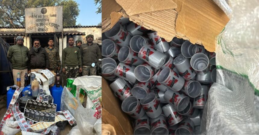 Bokaro: ज़िले के जरीडीह थाना क्षेत्र में उत्पाद विभाग ने बड़ी कार्रवाई करते हुए अवैध विदेशी शराब की मिनी फैक्ट्री का खुलासा किया है। सहायक आयुक्त उत्पाद, बोकारो के निर्देश पर गुप्त सूचना के आधार पर ग्राम तांत्री कुम्हारडीह में छापेमारी की गई। इस दौरान भारी मात्रा में अवैध विदेशी शराब, स्पिरिट और शराब बनाने में प्रयुक्त सामग्री बरामद की गई।