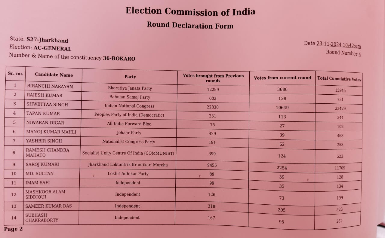 Bokaro: श्वेता सिंह कांग्रेस के पक्ष में शानदार बढ़त बनाए हुए हैं, जबकि भाजपा के बिरंची नारायण और झारखंड लोकतांत्रिक क्रांतिकारी मोर्चा की सरोज कुमारी काफी पीछे चल रहे हैं।