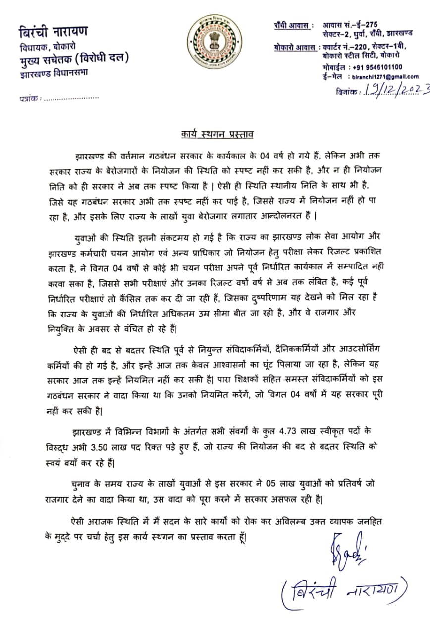 बोकारो विधायक बिरंची नारायण ने कहा कि युवाओं को नौकरी एवं रोजगार देने की मांग को लेकर कार्य स्थगन लाया था। पढ़ने का आग्रह किया तो विधानसभा से मार्शल आउट कर दिया गया। बेरोजगारों और युवाओं के लिए 100 बार भी मार्शल आउट होने के लिए तैयार हूं।