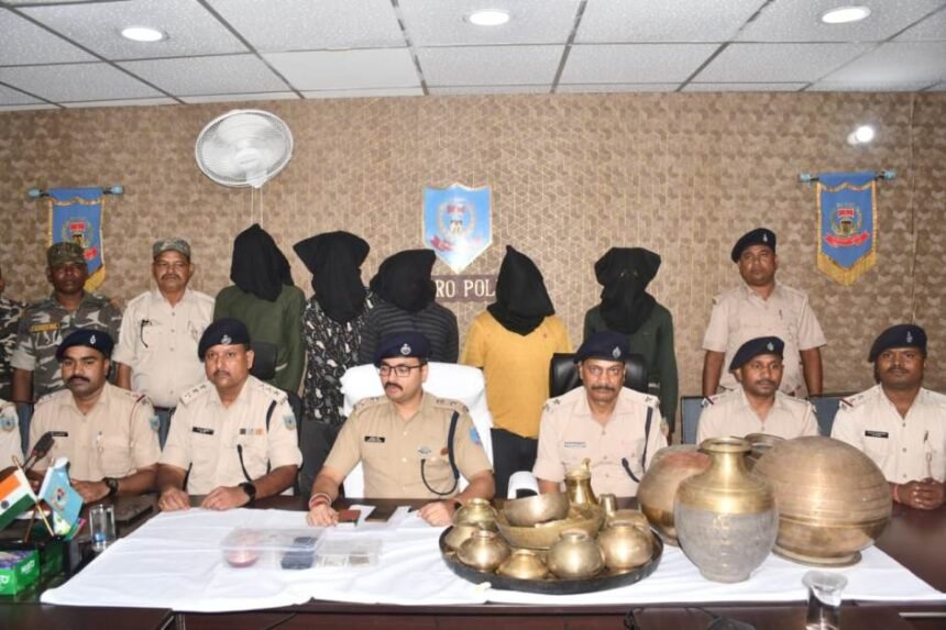 Bokaro: पुलिस ने जरीडीह थाने के इलाके में हुई चोरी की घटना का पर्दाफाश कर दिया है। स्पेशल इन्वेस्टिगेशन टीम (SIT) ने कार्रवाई करते हुए पांच अपराधियों को गिरफ्तार कर लिया। छापेमारी के दौरान पुलिस ने सोने-चांदी के गहने, 4,500 रुपये नकद, एक हुंडई कार, बर्तन और चोरी में इस्तेमाल किए गए उपकरण बरामद किए।