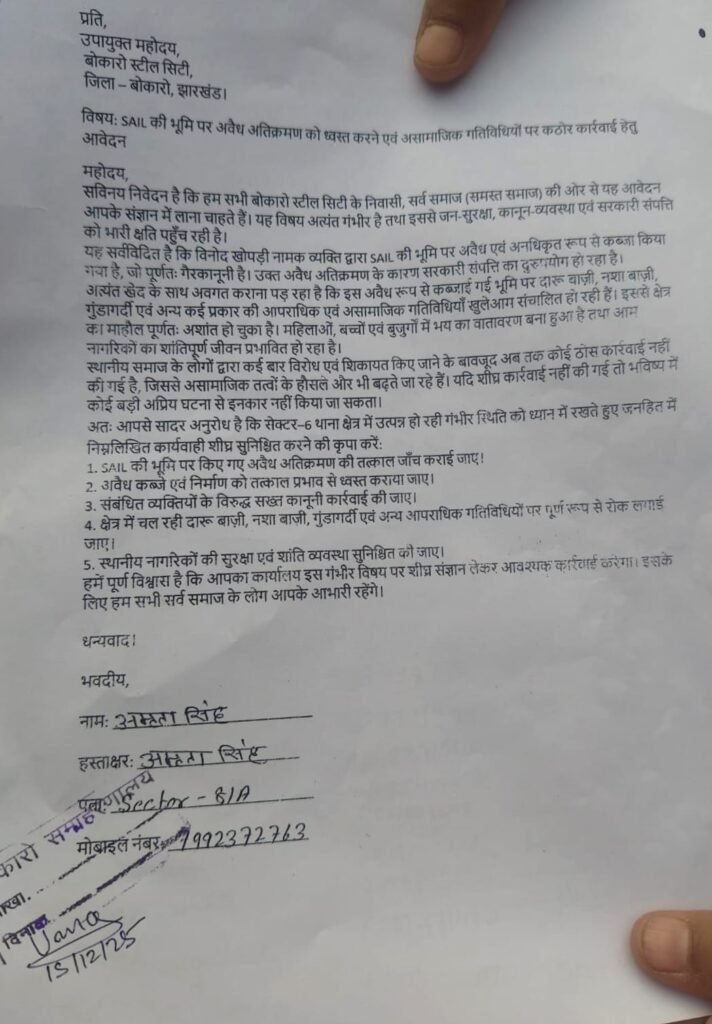 अपहृत की पत्नी अमृता ने डीसी बोकारो अजय नाथ झा को एक आवेदन दिया है। उन्होंने लिखा है कि “हम सभी बोकारो स्टील सिटी के निवासी, सर्व समाज (समस्त समाज) की ओर से यह आवेदन आपके संज्ञान में लाना चाहते हैं। यह विषय अत्यंत गंभीर है तथा इससे जन-सुरक्षा, कानून-व्यवस्था एवं सरकारी संपत्ति को भारी क्षति पहुँच रही है। यह सर्वविदित है कि विनोद खोपड़ी नामक व्यक्ति द्वारा SAIL की भूमि पर अवैध एवं अनधिकृत रूप से कब्जा किया गया है, जो पूर्णतः गैरकानूनी है। उक्त अवैध अतिक्रमण के कारण सरकारी संपत्ति का दुरुपयोग हो रहा है। अत्यंत खेद के साथ अवगत कराना पड़ रहा है कि इस अवैध रूप से कब्ज़ाई गई भूमि पर दारू बाज़ी, नशा बाज़ी, गुंडागर्दी एवं अन्य कई प्रकार की आपराधिक एवं असामाजिक गतिविधियाँ खुलेआम संचालित हो रही हैं। इससे क्षेत्र का माहौल पूर्णतः अशांत हो चुका है। महिलाओं, बच्चों एवं बुजुर्गों में भय का वातावरण बना हुआ है तथा आम नागरिकों का शांतिपूर्ण जीवन प्रभावित हो रहा है। स्थानीय समाज के लोगों द्वारा कई बार विरोध एवं शिकायत किए जाने के बावजूद अब तक कोई ठोस कार्रवाई नहीं की गई है, जिससे असामाजिक तत्वों के हौसले और भी बढ़ते जा रहे हैं। यदि शीघ्र कार्रवाई नहीं की गई तो भविष्य में कोई बड़ी अप्रिय घटना से इनकार नहीं किया जा सकता। “