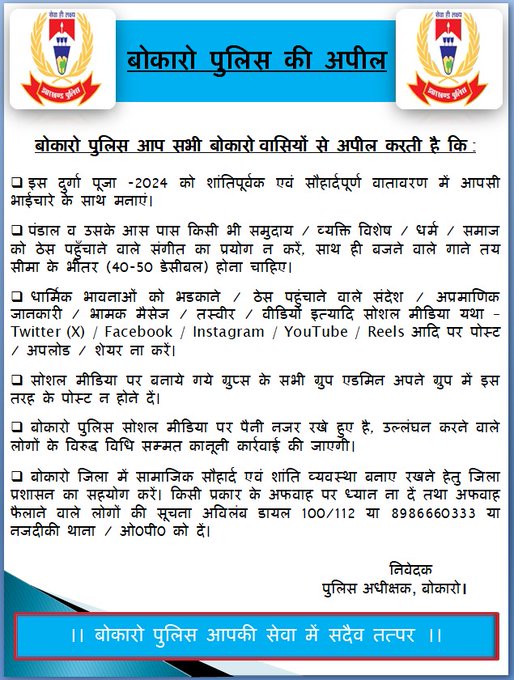 बोकारो पुलिस ने यह भी स्पष्ट किया कि जो लोग धार्मिक भावनाओं को आहत करने या कानून का उल्लंघन करने वाली गतिविधियों में संलिप्त पाए जाएंगे, उनके खिलाफ कड़ी कानूनी कार्रवाई की जाएगी। त्योहारों के दौरान शांति बनाए रखने के लिए पुलिस सतर्क है और लोगों को इस मामले में सहयोग करने की आवश्यकता है। बोकारो पुलिस ने सभी नागरिकों से शांति और सौहार्दपूर्ण तरीके से त्योहार मनाने की अपील की है।