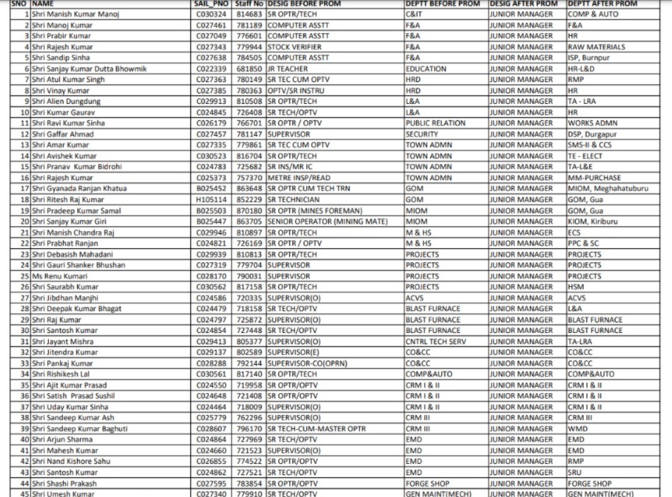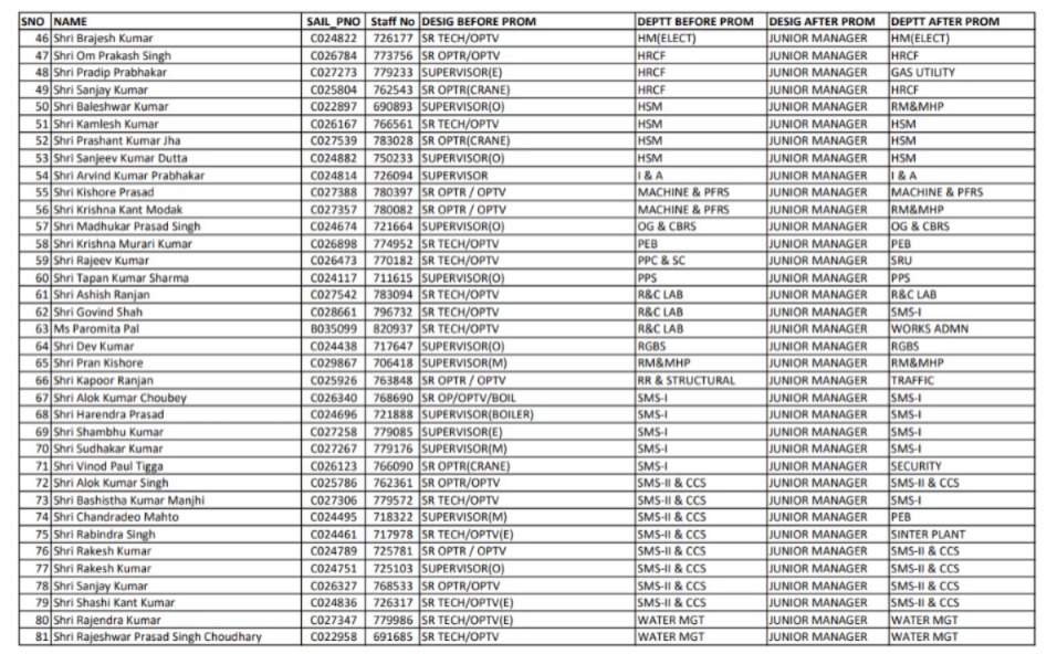 Bokaro: बोकारो स्टील प्लांट (BSL) के कुल 81 कर्मियों को जूनियर अधिकारी के पद पर प्रमोट कर दिया गया है, जिसमें से एक का ट्रांसफर दुर्गापुर, एक का बर्णपुर और दो का एसआरयू में किया गया है। एग्जीक्यूटिव डायरेक्टर (पीएंडए), बीएसएल, राजन प्रसाद ने सभी नवप्रोन्नत जूनियर अधिकारियों को बधाई दी है। Click to join Whatsapp: https://whatsapp.com/channel/0029Va98epRFSAsy7Jyo0o1x