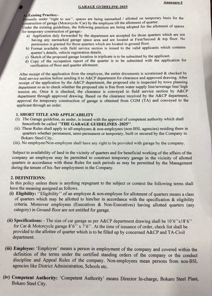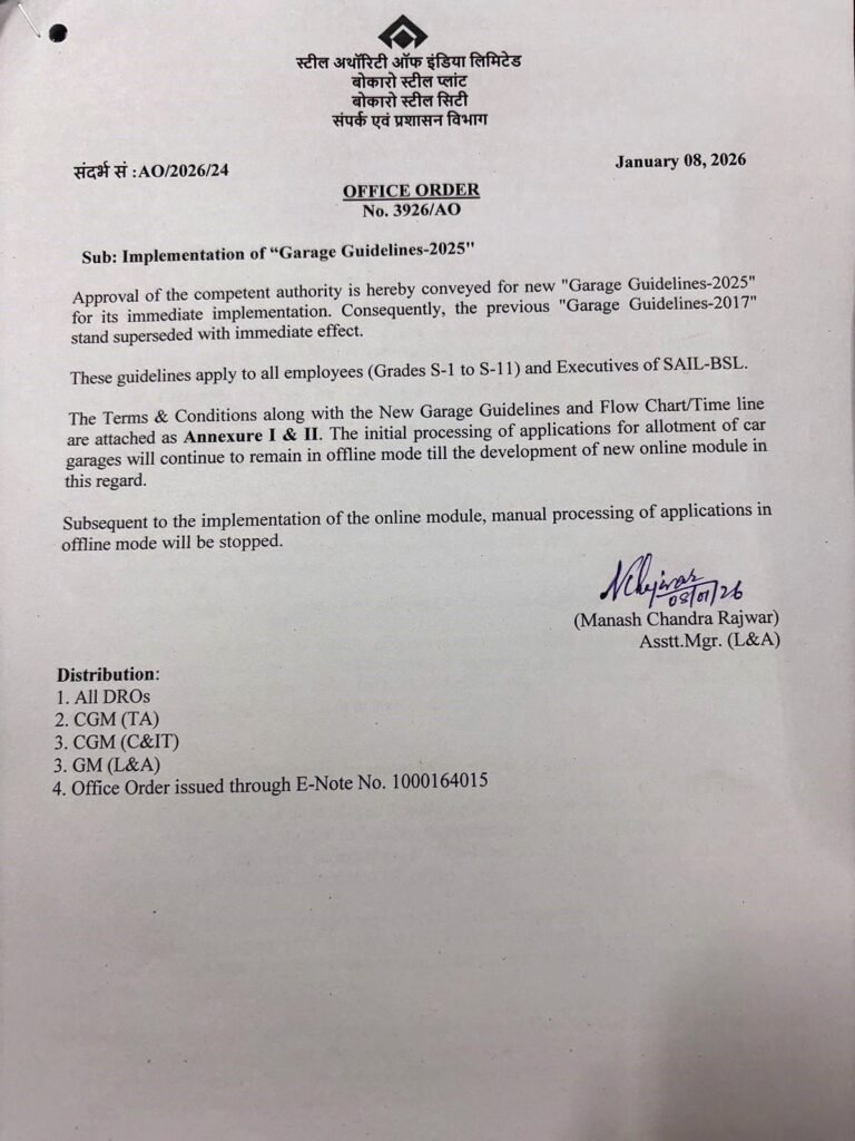 Bokaro: बोकारो स्टील प्लांट (BSL) प्रबंधन ने कर्मचारियों की सुविधा को ध्यान में रखते हुए नई ‘गैरेज गाइडलाइन-2025’ लागू कर दी है। इस नई व्यवस्था के तहत बीएसएल क्वार्टरों, विशेषकर ऊपरी मंजिलों में रहने वाले कर्मचारियों को अपने वाहनों की सुरक्षित पार्किंग की सुविधा मिलेगी। गाइडलाइन के लागू होने के बाद अब निवासी वैध रूप से निर्मित गैराज में नियमों के तहत अपनी गाड़ियां रख सकेंगे, जिससे पार्किंग से जुड़ी समस्याओं में कमी आएगी। (गैरेज गाइडलाइन की कॉपी सबसे नीचे देखे -)
