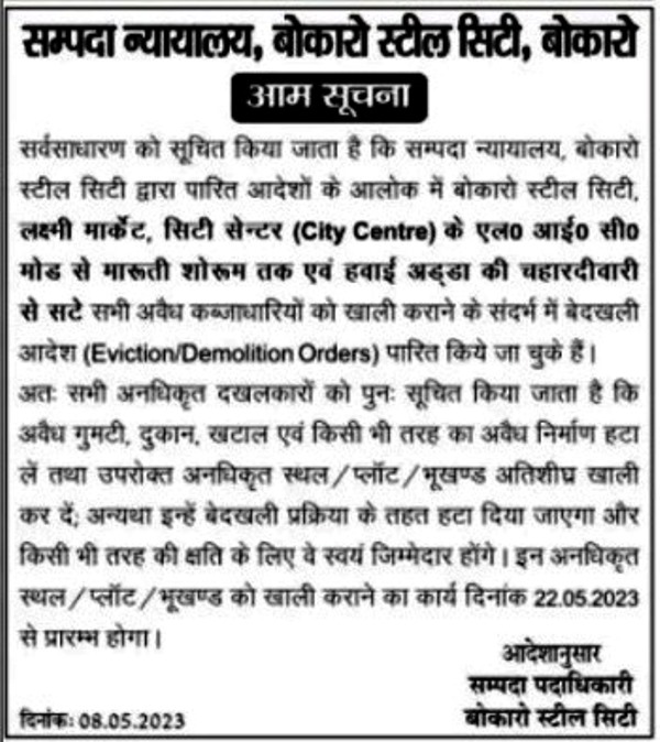 साथ ही दूसरी ओर हवाई अड्डा की चहारदीवारी से सटे कब्जाधारियों को भी हटाया जायेग। जानकारी के मुताबिक संपदा न्यायालय बोकारो ने इस संबंध में सोमवार को आम सूचना जारी की है।
