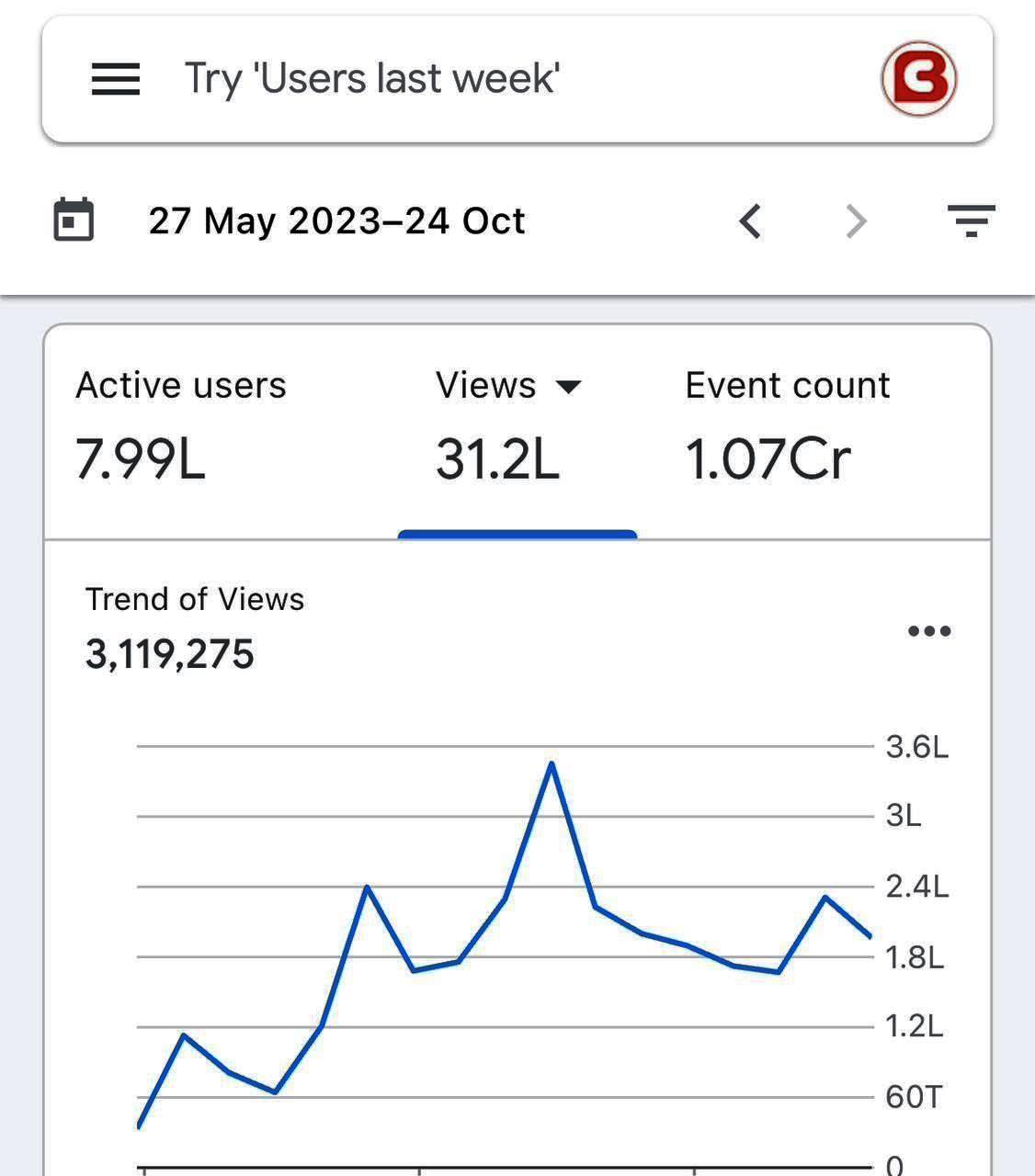 Bokaro: बोकारो के लोकप्रिय न्यूज़ पोर्टल www.currentbokaro.com ने बड़ी सफलता हासिल की है। Google Analytics के हालिया आंकड़ों के अनुसार, 27 मई 2023 से 24 अक्टूबर 2024 के बीच पोर्टल पर 7.99 लाख एक्टिव यूज़र्स दर्ज किए गए। इसके साथ ही, 31.2 लाख व्यूज़ और 1.07 करोड़ इवेंट्स ने पोर्टल की बढ़ती लोकप्रियता को साबित किया है।