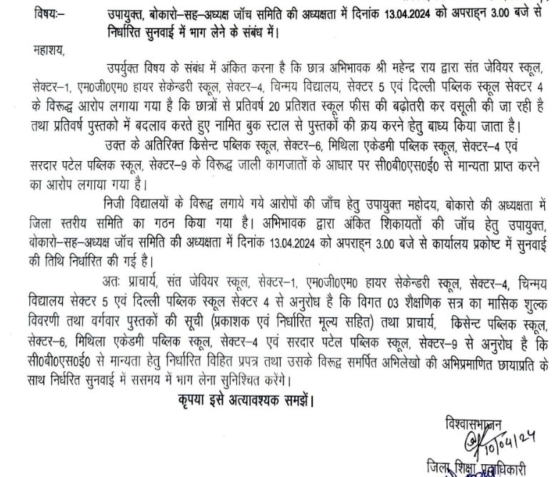 Bokaro: The district administration of Bokaro has initiated an inquiry into allegations raised by concerned parents against several private schools in the area.