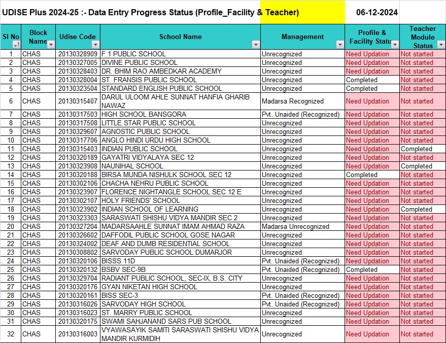 Bokaro: जिले के 32 प्राइवेट विद्यालयों द्वारा यूडीआईएसई+ पोर्टल पर आवश्यक डेटा प्रविष्टि में देरी की जा रही है। शैक्षिक अधिकारियों ने इन विद्यालयों को 8 अक्टूबर 2024 तक प्रोफाइल फैसिलिटी और शिक्षक मॉड्यूल को अपडेट करने का निर्देश दिया था, लेकिन अब तक कई विद्यालयों ने इस कार्य को पूरा नहीं किया है। इसमें कई प्रमुख विद्यालय शामिल हैं।