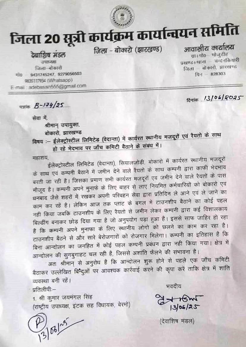 Bokaro: ज़िला 20 सूत्री कार्यक्रम कार्यान्वयन समिति के उपाध्यक्ष के नेतृत्व में एक प्रतिनिधिमंडल ने बोकारो उपायुक्त अजय नाथ झा से मुलाकात कर ESL स्टील लिमिटेड (वेदांता) सियालजोड़ी में हो रही अनियमितताओं पर चिंता जताई। उन्होंने कंपनी के खिलाफ एक जांच टीम गठित करने की मांग की। Follow the currentbokaro channel on WhatsApp: https://whatsapp.com/channel/0029Va98epRFSAsy7Jyo0o1x