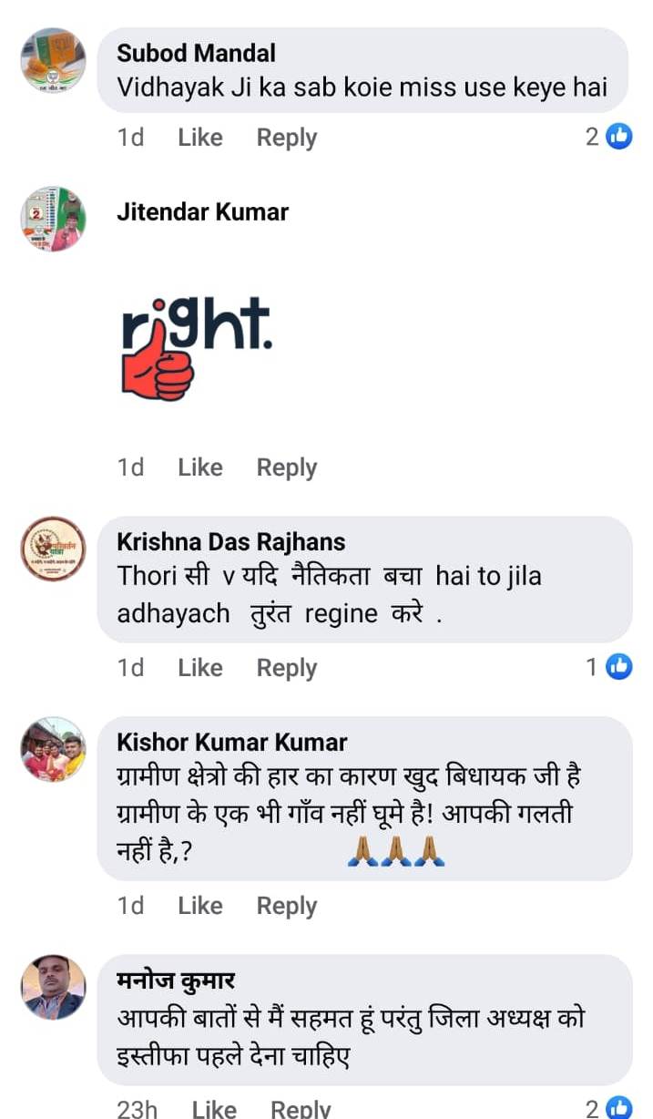 जो लोग आज दूसरे को गद्दार कह रहें है,तो उनको तो अपनी भूमिका सार्थक रूप से निभाने की जरूरत थी । गोतियारी में अगर गोतिया को ना पूछा जाए तो वो तुरंत आपका विरोध करने लगता है,पार्टी के सभी सदस्यों को साथ लेकर चलने में क्या दिक्कत थी ।माननीय सांसद ढुल्लू जी आए नहीं और उनके डर से निवर्तमान को बुलाए नहीं। छोटे से छोटे कार्यकर्ता के खिलाफ खुलकर आना किसी जनप्रतिनिधि का घातक हो ही जाएगा ।