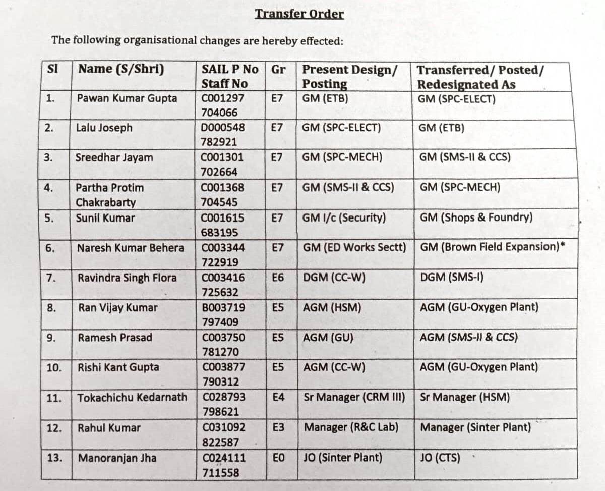 Bokaro: बोकारो इस्पात संयंत्र (BSL) प्रबंधन ने आज गुरुवार को छह जीएम सहित अपने 13 अधिकारियों का ट्रांसफर कर दिया। ट्रांसफर किये गए अधिकारियों में टाउनशिप के सिक्योरिटी डिपार्टमेंट के जेनेरल मैनेजर इंचार्ज सुनील कुमार भी है। उन्हें प्लांट के अंदर शॉप एंड फाउंड्री विभाग भेजा गया है।