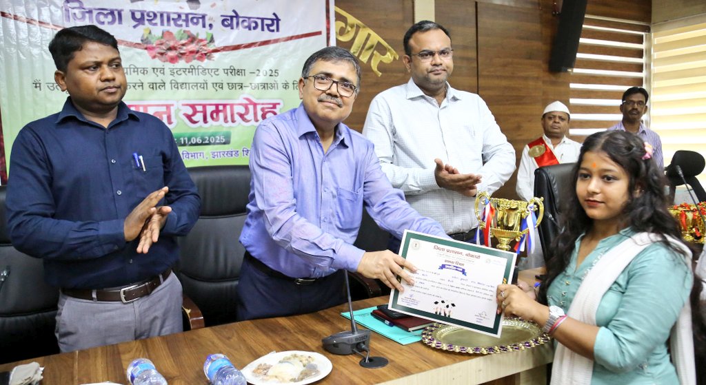 Bokaro: समाहरणालय स्थित सभागार में बुधवार को वार्षिक माध्यमिक एवं इंटरमीडिएट परीक्षा 2025 में उत्कृष्ट प्रदर्शन करने वाले छात्र – छात्राओं के लिए सम्मान समारोह का आयोजन किया गया। समारोह की अध्यक्षता उपायुक्त श्री अजय नाथ झा ने किया। Follow the currentbokaro channel on WhatsApp: https://whatsapp.com/channel/0029Va98epRFSAsy7Jyo0o1x