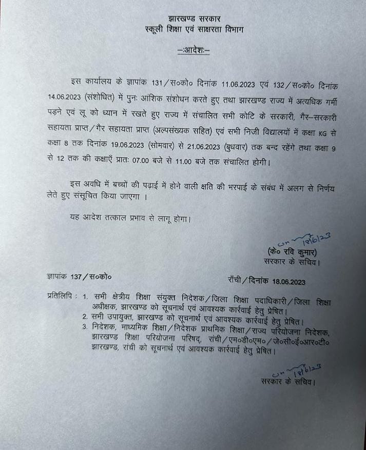 बताया जा रहा है कि रविवार को पुनः आंशिक संशोधन करते हुए तथा झारखण्ड राज्य में अत्यधिक गर्मी पड़ने एवं लू को ध्यान में रखते हुए राज्य में संचालित सभी कोटि के सरकारी, गैर-सरकारी सहायता प्राप्त / गैर सहायता प्राप्त (अल्पसंख्यक सहित) एवं सभी निजी विद्यालयों में कक्षा KG से कक्षा 8 तक दिनांक 19.06.2023 (सोमवार) से 21.06.2023 (बुधवार) तक बन्द करने की घोषणा कर दी है।