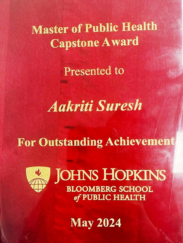 23-year-old Dr. Aakriti remarkable capstone project, titled “Exploring Spatial and Temporal Distribution of Gun Violence in Baltimore City, Maryland,” has been distinguished by the MPH Capstone Awards Committee, earning her the prestigious MPH Capstone Award plaque for her outstanding academic achievement at Johns Hopkins University.