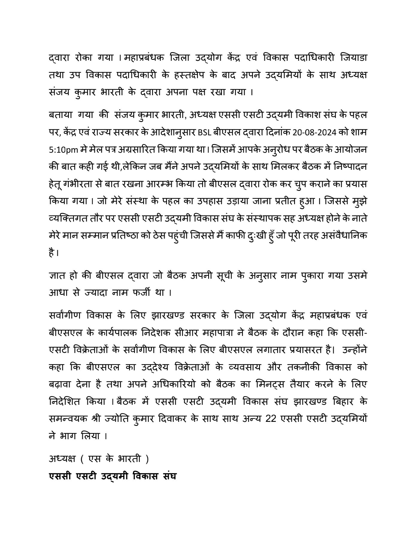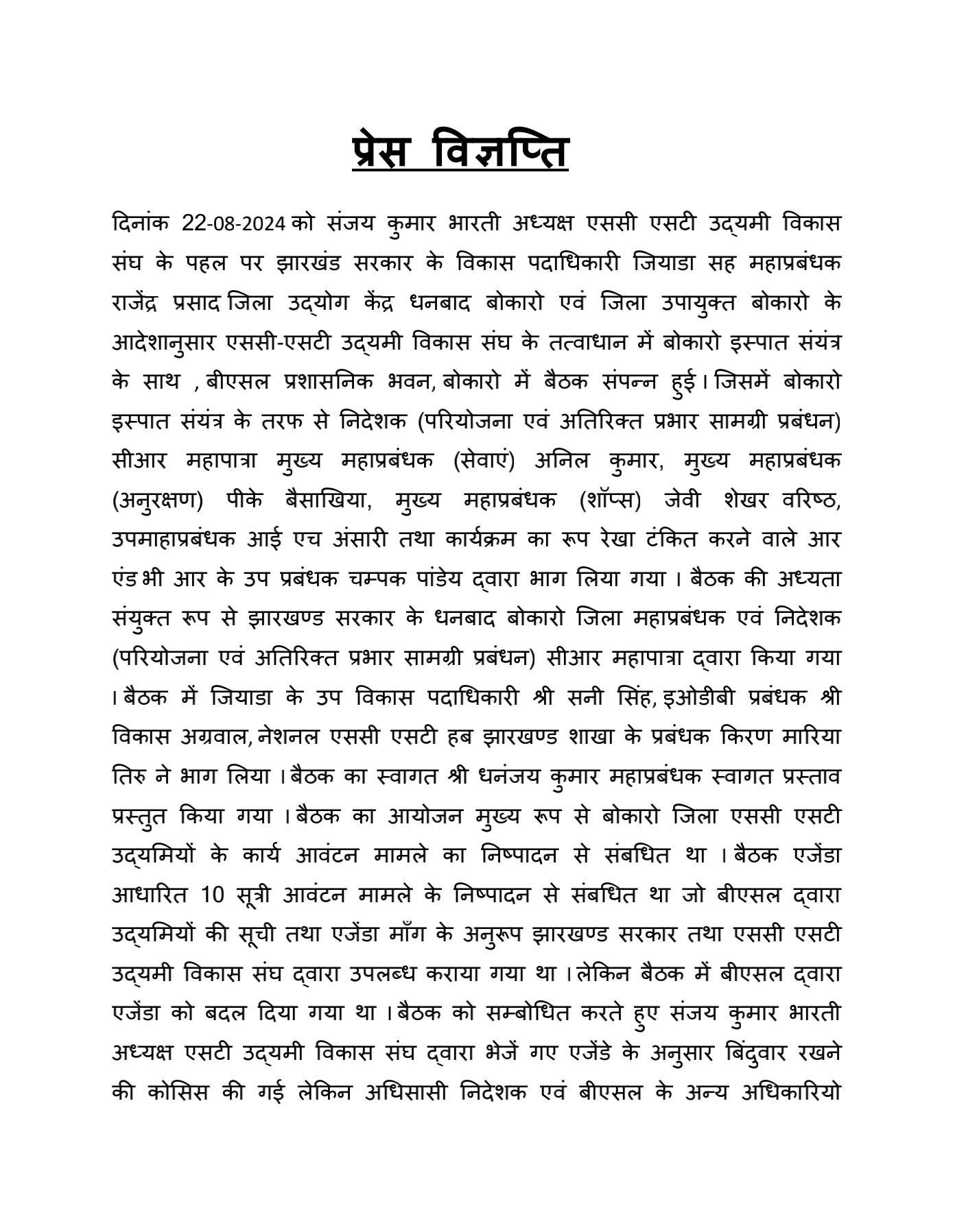 Bokaro: बोकारो स्टील प्लांट (BSL) के अधिशासी निदेशक (परियोजनाएँ एवं अतिरिक्त प्रभार सामग्री प्रबंधन) सी आर महापात्रा की अध्यक्षता में एससी/एस टी वेंडर्स के साथ एक महत्वपूर्ण बैठक का आयोजन किया गया। इस बैठक में बीएसएल के वरिष्ठ अधिकारी और झारखंड सरकार के प्रतिनिधि भी शामिल हुए। मुख्य महा प्रबंधक (सेवाएँ) अनिल कुमार, मुख्य महा प्रबंधक (अनुरक्षण) पी के बैसाखिया, मुख्य महा प्रबंधक (शॉप्स) जे वी शेखर, और अन्य प्रमुख अधिकारी इस बैठक में उपस्थित रहे।