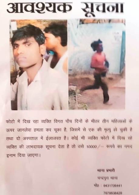एक के बाद एक इन घटनाओ को अंजाम देने वाले आरोपी अजय रविदास को लोग ‘सनकी और साइको किलर’ बुला रहे है और खासे डरे हुए है। खासतौर पर महिलाएं बेहद डरी हुई है। आरोपी अजय रविदास चंद्रपुरा का रहनेवाला है और फरार है। चंद्रपुरा में एक के बाद एक दो घटनाओ के होने से पुरे खौफ इलाके में खौफ का माहौल है। पुलिस ने आरोपी अजय की सुचना देने वाले को 10 हज़ार नकद इनाम देने की घोषणा की है।