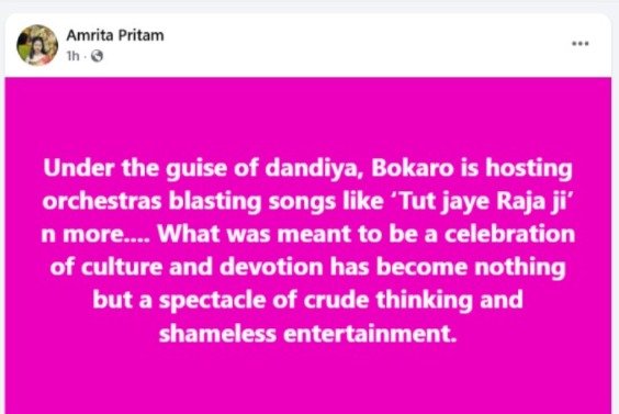 जहाँ देशभर में लोग गरबा और डांडिया को माँ दुर्गा की भक्ति के साथ मना रहे हैं, वहीं बोकारो से चौंकाने वाली तस्वीर सामने आई है। डांडिया के नाम पर आयोजित आयोजनों में भोजपुरी और अन्य फूहड़ गानों पर डांस हो रहा है। हाल ही में वेस्टर्न फॉर्म में आयोजित कार्यक्रम में अभिनेत्री आम्रपाली दुबे का डांस वीडियो वायरल हुआ, जिसमें वह “टूट जाई राजा जी पलंग सागवान के” जैसे गानों पर ठुमके लगाती नजर आईं। यह दृश्य देखकर कई लोग आहत हो गए।