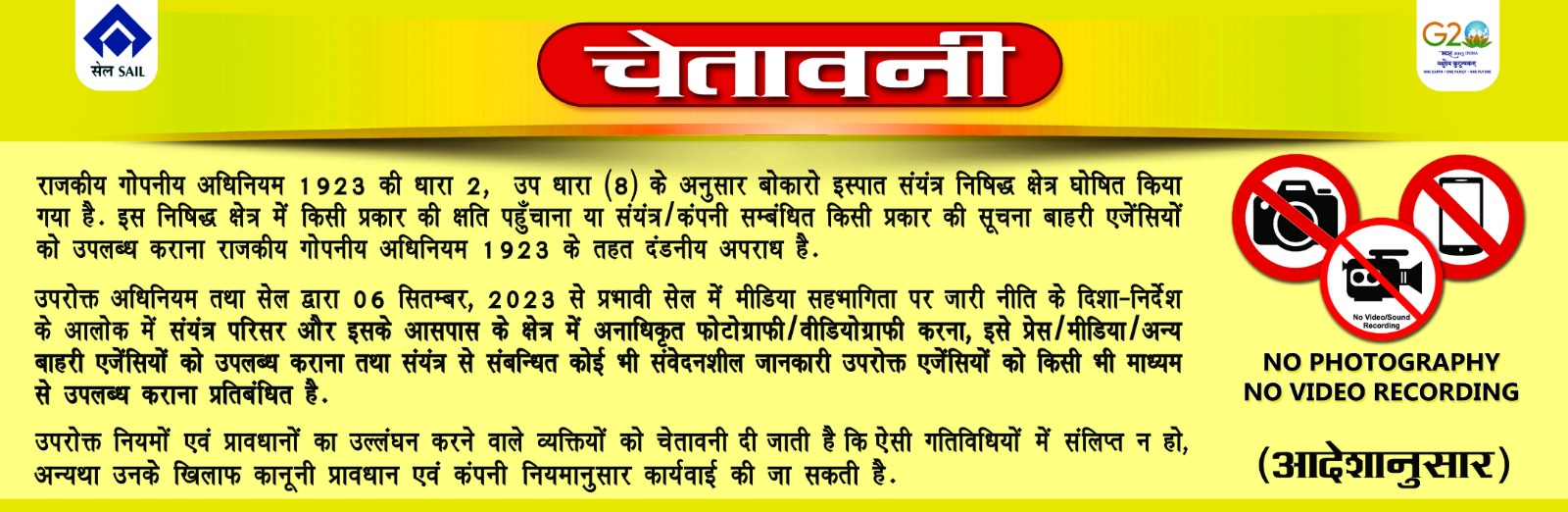 उपरोक्त अधिनियम तथा सेल द्वारा 06 सितम्बर, 2023 से प्रभावी सेल में मीडिया सहभागिता पर जारी नीति के दिशा-निर्देश के आलोक में संयंत्र परिसर और इसके आसपास के क्षेत्र में अनाधिकृत फोटोग्राफी / वीडियोग्राफी करना, इसे प्रेस/मीडिया/ अन्य बाहरी एजेंसियों को उपलब्ध कराना तथा संयंत्र से संबन्धित कोई भी संवेदनशील जानकारी उपरोक्त एजेंसियों को किसी भी माध्यम से उपलब्ध कराना प्रतिबंधित है.