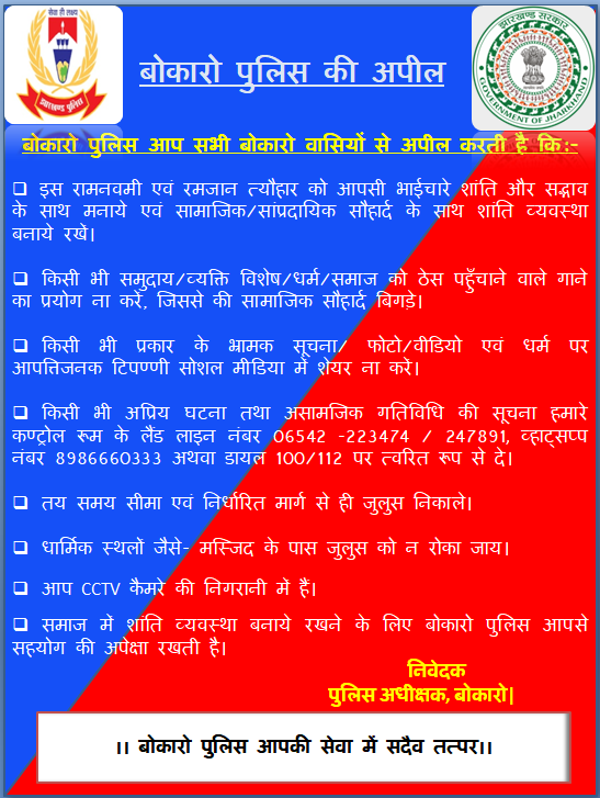 Bokaro: आगामी 30 मार्च 2023 को रामनवमी का पर्व मनाया जायेगा। उक्त अवसर पर जुलूस निकाले जाने की परम्परा है, जिसमें काफी संख्या में भीड़ होने की संभावना रहती है। बताया गया कि संवेदनशील स्थानों (मस्जिद के समीप आदि) से जुलूस को संयमित रूप से निकालने में स्थानीय प्रशासन के साथ अखाड़ा समिति की भी नौतिक जिम्मेवारी रहेगी।