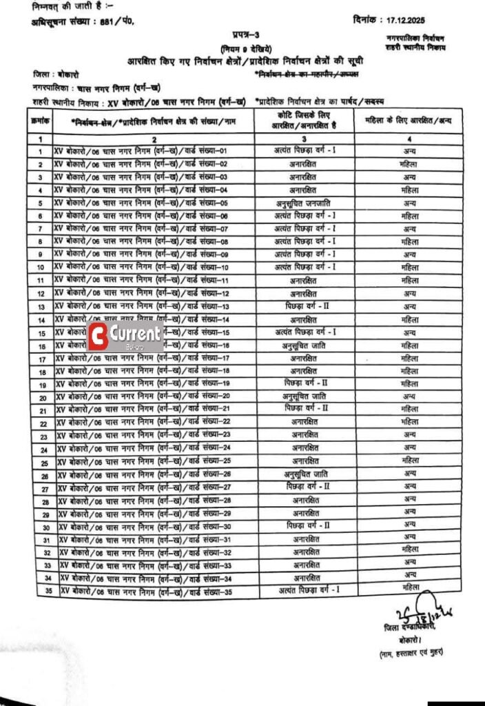 Bokaro: जिला प्रशासन ने चास नगर निगम (Chas Municipal Corporation) के वार्डों के लिए आरक्षित एवं अनारक्षित निर्वाचन क्षेत्रों की सूची जारी की है। अधिसूचना संख्या के तहत कुल 35 वार्डों के लिए आरक्षण का विवरण दिया गया है। इनमें कुछ वार्ड महिला उम्मीदवारों के लिए, कुछ अत्यंत पिछड़ा वर्ग (EBC), पिछड़ा वर्ग (OBC) और अनुसूचित जाति-जनजाति के लिए आरक्षित हैं।